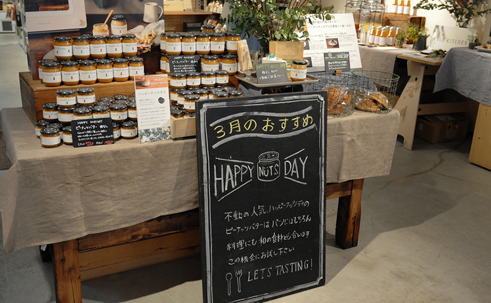 スケボー仲間から始まったピーナッツバターブランド “ HAPPY NUTS DAY ” 。ピーナッツバターに使われている落花生は千葉県産を使用し、通常より焙煎を強くしているそうです。取材時に試食させてもらったのですが、今まで味わったことのない香ばしさや風味がありました。無添加でてんさい糖を使ったピーナッツバターは、やさしい甘さでパンに塗って食べる他、料理にも使えそうです。代表の中野さんや、商品開発の錦さんは、一見すると街にいる普通のお兄さんですが、商品へのこだわりは強く、ブランドロゴからパッケージまでも自社内で手掛け、オーバーオールを着て商品説明している姿も、その商品も、すべてが魅力的に見えました。