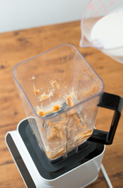 粘度が強いピーナッツバターはゴムベラで取りきれず残ってしまうことがあります。このまま洗ってしまうのはもったいない! おいしいピーナッツバターミルクを作りましょう。牛乳を注いで、ミキサーで撹拌して、グラスに注げば、残ったピーナッツバターも余すところなくいただけます。