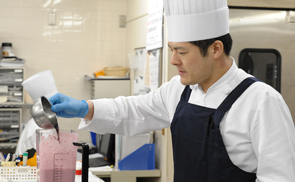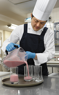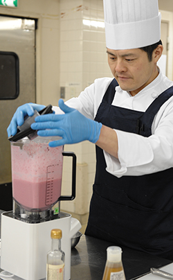| 村田さん: | 他の調理機器ではスイッチの隙間に食材が入り込んでお手入れするのが大変だったりするのですが、こちらのブレンダーは本体に溝や隙間が少ないデザインなので、本体に付着した汚れもサッと拭けてお手入れは楽です。こちらの厨房ではいつも整理整頓・清潔を心がけているのでそういった点でも気に入ってます。 |