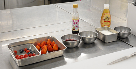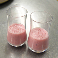 | 村田さん: | 新しいメニューとして朝食に飲んでいただくドリンクメニューをこちらの材料で考えています。ロテルド比叡では滋賀郷土料理の発酵料理をディナーで提供しているので、翌朝はさっぱりしたドリンクを飲んで口や胃をすっきりさせる朝の目覚めの一杯として、ベリーとビネガーを使ったドリンクを考案してみました。 |
